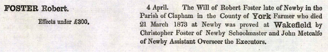 In the 1871 census, Robert is aged 78 and a farmer of two acres; his wife Elizabeth is 65 years old and they no longer have any children living with them and they have moved to Newby.