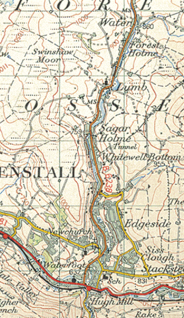 Here is an extract from an ordnance survey map of Rossendale in 1950; you can see the main A681 Bacup Road at the bottom in red going through Waterfoot; the B6238 is Burnley Road East, which leads up to Lumb. If you carry up this road you will come to Water, which is where Edmund's father, James came from; his mother, Rachel, came from Edgeside which is back down the road, towards Stacksteads.
