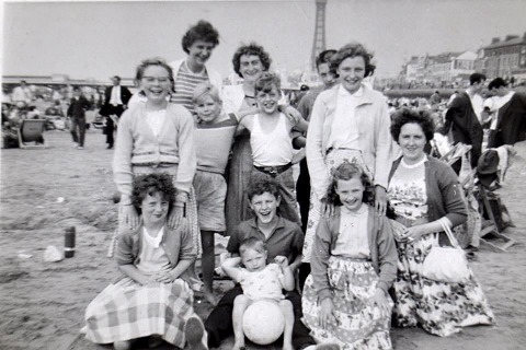 And here is one with some of our gang on a trip to Blackpool. Front row: Ivy Eccles, Stephen Foster, Tommy Turnbull (?), Pauline Roberts. Middle row: me, two lads I don't know, Valerie Roberts, at end my mum, Bessie Foster; backrow: Isabel (?), Mary Eccles, Harold Thornber.
