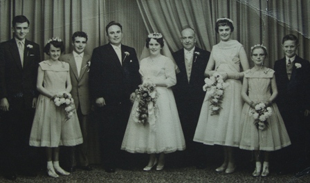 My cousin Kathleen's wedding was the fourth time I was a bridesmaid. And I could have my hair as I wanted it - so I had it in a pony tail and not the dreaded ringlets! My mum made mine and Christine's (my cousin) dresses, they were green. My cousin Barry is on the left, then Christine, Jack's brother, Norman, Jack, Kathleen, uncle Jim, cousin Marion, me and Stephen. In fact, six of the nine grand-children are present, the other three being Kathleen's brothers Tommy and Jimmy and Christine's sister, Winifred.