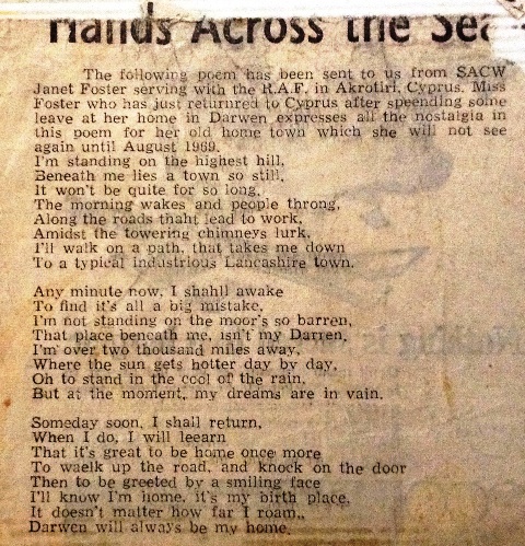There was also a big anniversary back in the UK and RAF personnel were invited to apply to attend this. Myself and my friend Eileen (seen in a photograph below) were both selected. When we got back to the UK instead of going to the parade we both decided we would prefer to go and see our relations, so we did (we never did get found out!). On return to Cyprus I wrote the following poem which was printed in the Darwen Advertiser: