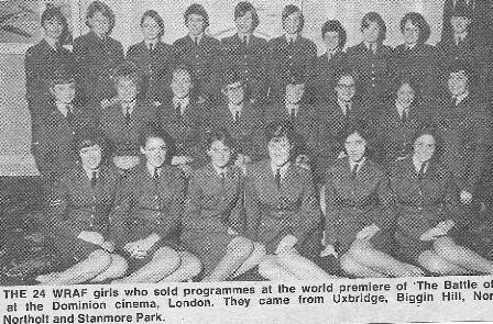 When the film, "The Battle of Britain" was launched I volunteered to help at the premier at the Dominion cinema in Leicester Square - I presented a bouquet of flowers to the mayoress of Camden Town! Sorry for this poor photograph but it is a copy of one that appeard in the RAF News. I am second from left on the middle row: