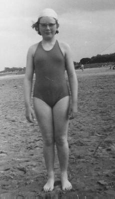 And here is one of me on the beach, I thought it was Blackpool but the beach would have been packed so it must have been Lytham St Annes - we used to go there a lot and played in the sand dunes. I was a good swimmer. We were taught to swim at junior school (by the mother of the teacher who slapped me. Her way of teaching people who were scared was to push them in at the deep end to force them to swim). I loved swimming; we used to go, me, Stephen and Ivy Eccles, with her dad, Ralph Eccles, to Darwen swimming baths regularly on a Sunday morning and get back in time for the morning service at Redearth Road Methodist church.
