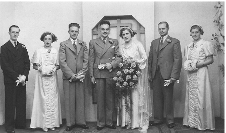 And here is a photo of her when she was a bridesmaid at uncle Tom and aunty Lily's wedding in 1937; she is on the left, standing next to her other brother, uncle Jim, and is about 12 years old.