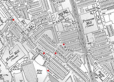Malta Street has also been pulled down, but here is a map (1909) which shows where it was - marked in red, as is India Street, Redearth Road and Crown Street, which is where my grandma, Bridget lived when she married Joseph, but this has also been pulled down: