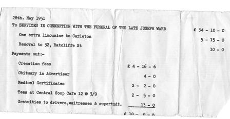 In 1911 Joseph was 29 years old and a cotton weaver; he was living with Bridget, 26, who was working as a charwoman. They had been married five years and had three children: James, 4 years; May 3 years; and Kathleen, 3 months old. They were living at 11 Malta Street, which was a two-up, two-down. Betsy Ward, his mother, aged 64, was also living there. Joseph and Bridget had two more children Tom, who was born in 1913, and my mum Beatrice (Bessie), born in 1925. The Catholic church allowed Joseph and Bridget to marry at St John's Church of England on the agreement that they bring up their first born to be Catholic; hence uncle Jim, who later married May Orrell, was christened Catholic, as were their two daughters, Winifred and Christine. This was a bit confusing when we were kids as the rest of the family were brought up Church of England. Joseph died on 23rd May 1951 aged 69 years. He died at 80 Redearth Road. He was a retired cotton weaver and the cause of death was a) myocardial degeneration and b) chronic bronchitis. He was certified by Dr Miller. He was cremated at Carlton Crematorium, Poulton-le-Flyde: