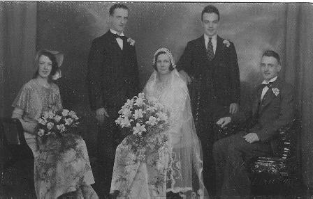 Jim Ward married May Orrell, here is their wedding photograph; aunty Kit (Kathleen Ward) is on the left; then Jim Ward, May Orrell, Tom Ward and I don't know who their best man was: